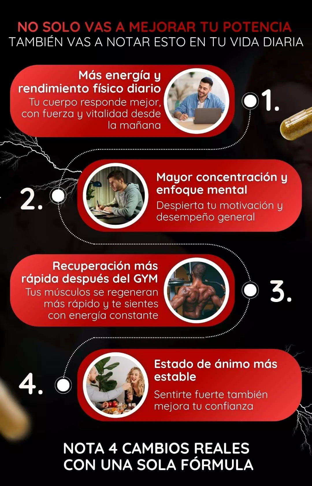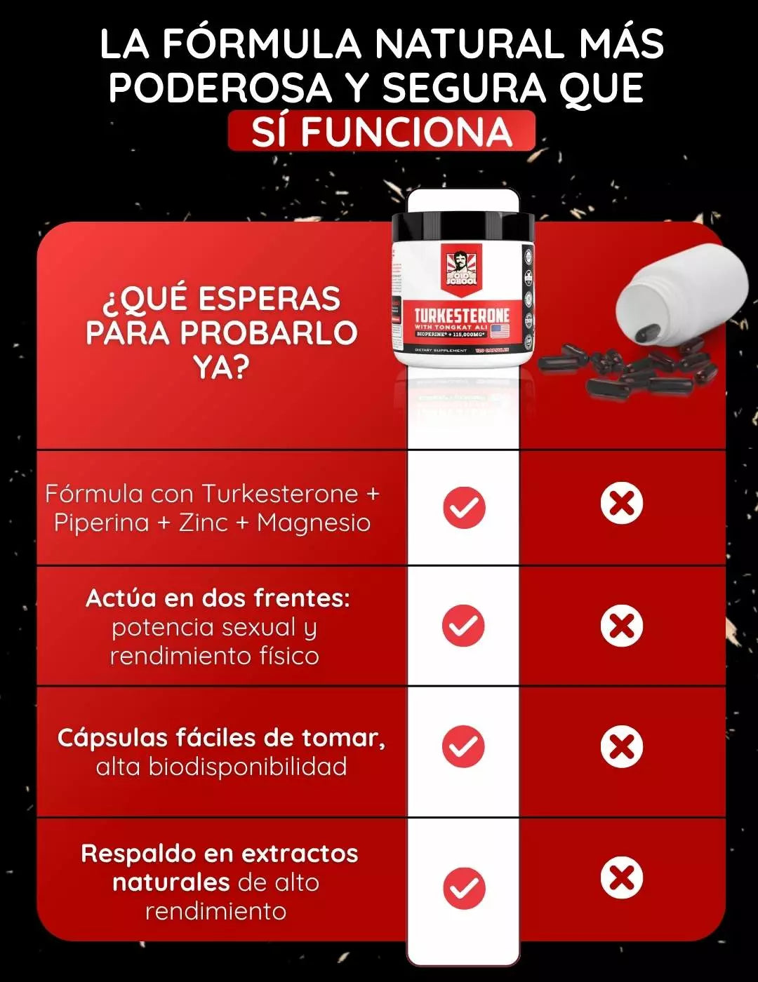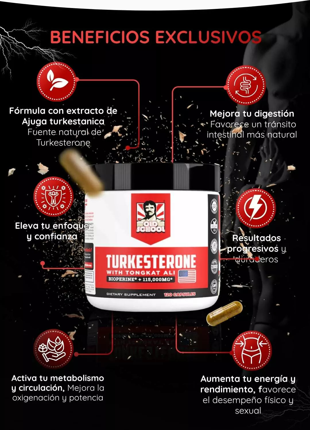 La página lo presenta como suplemento para fuerza, potencia y vitalidad, pero como siempre, es recomendable consultar con un profesional de salud, especialmente si tienes condiciones médicas o estás tomando medicamentos.